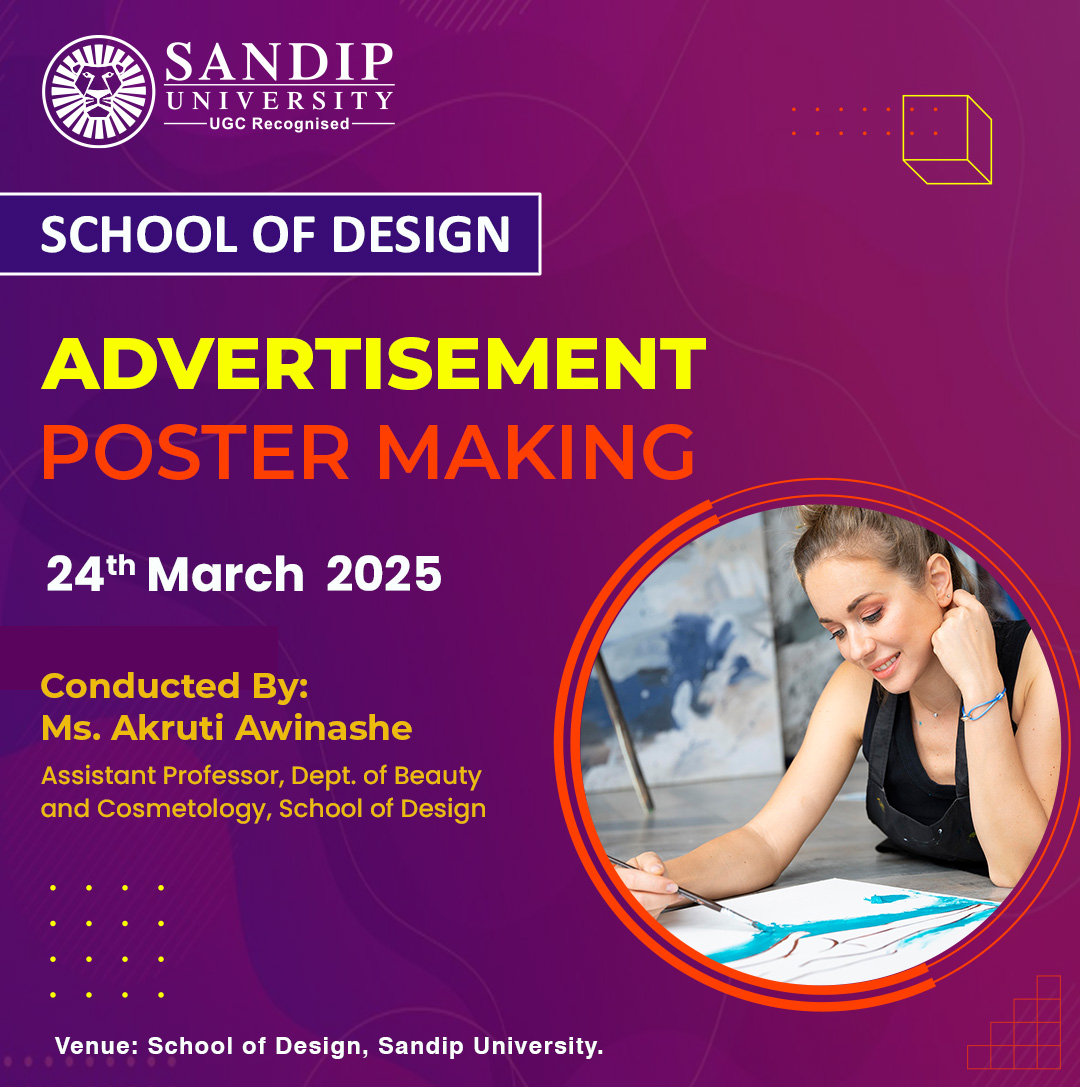 The School of Design at Sandip University, Nashik, conducted a Value-Added Program titled Advertisement Poster Making on Saturday, 22nd March, 2025. This event was made possible with the support of our OSD Prof. Vivek Nikam Sir,under the visionary leadership of our respected dean (Prof.) Dr. Vibha Kapoor and our dedicated Design HOD Dr. Taruna Rajpurohit Ma’am, and Beauty Cosmetology HOD Dr. Rajashree Saoji Ma’am.