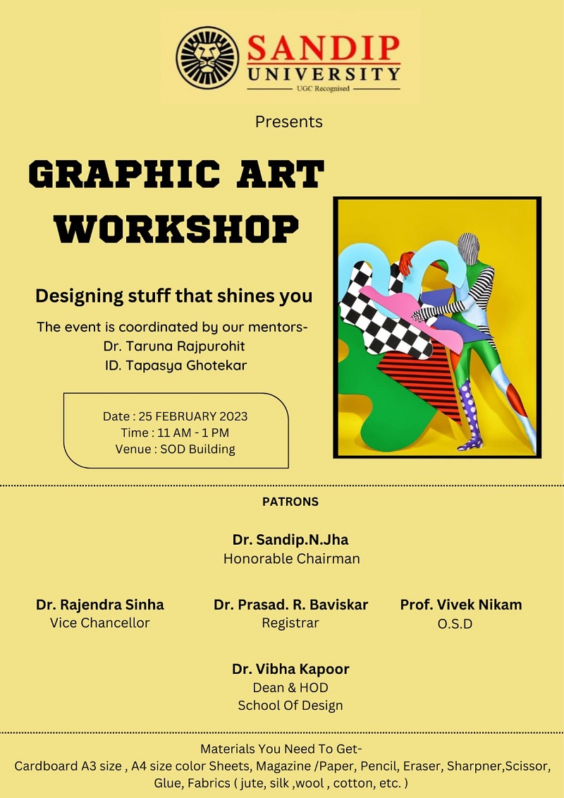 Event Detail: Graphic Art Workshop organized for School of Design students with an aim to make students well aware of the importance of graphics in design and with the latest trends used in the design field as a visual communication.