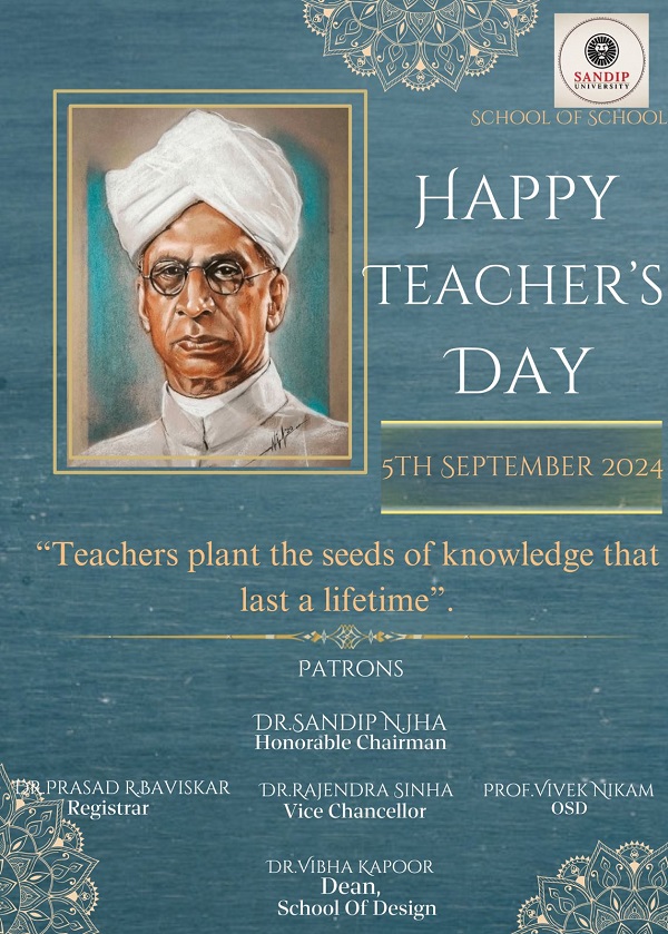 On September 5th, 2024, the School of Design at Sandip University celebrated a delightful Teacher’s Day event. The celebration was held under the esteemed guidance of our Respected OSD, Prof. Vivek Nikam Sir, with the gracious presence of our Respected Dean, Dr. Vibha Kapoor Ma’am, along with our esteemed HoDs and faculty members.