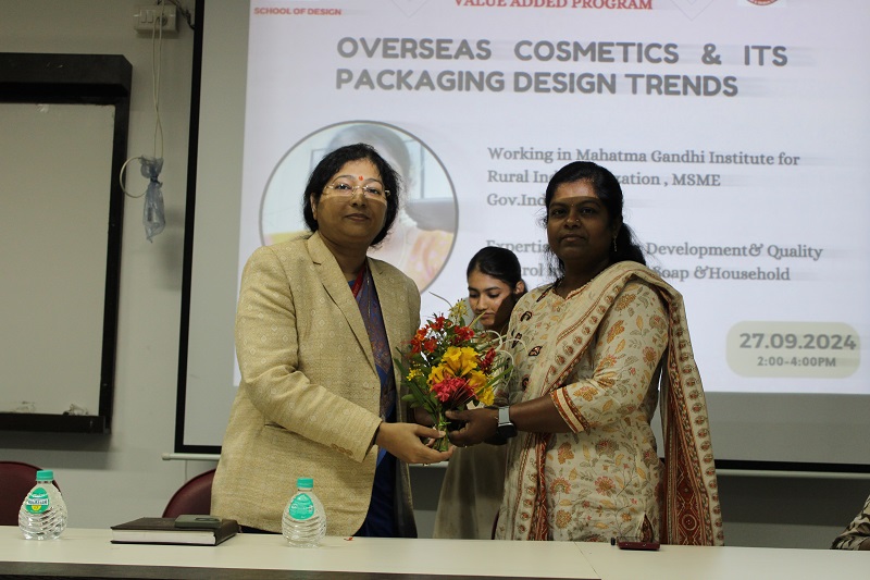 On 27th September 2024, the School of Design conducted a Value Added Program (VAP) on “Overseas Cosmetics and Packaging Design Trends,” led by Uma There Ma’am from the Mahatma Gandhi Institute of Rural Industrialization (MGIRI), Wardha, a national institute under the Ministry of MSME, Government of India. With the support of Respected OSD Prof. Vivek Nikam sir , Under the guidance of Respected Dean Dr. Vibha Kapoor ma’am,dedicated HOD’s and faculty members. The session covered global trends in cosmetic packaging, emphasizing aesthetics, sustainability, and cultural influence. Respected Dean Ma’am also shared her valuable thoughts, encouraging students to stay innovative and adapt to emerging global trends. The session provided key insights into design strategies and trends in the international cosmetics industry, making it an enriching experience for all participants.